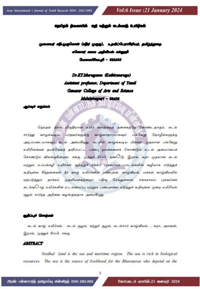 The Aran Journal has been launched with the main objective of publishing research articles, which is associated with Tamil culture, civilization, and Tamil literature. Several reports revealed that Tamil civilization is one of the oldest cultural development in human evolution. Even though studies proved the ethnicity of Tamil Nadu and Tamil people, proper scientific documentation are not completely furnished. Several archeological studies have provided a way for further detailed research on Tamil civilization and culture that may help to explore the ancient history of Tamil people and Tamil culture. We wish to publish thoughts to provoke research in the area of Tamil culture, civilization, literature, archeological evidence, inscriptions, ancient coinage, culture, art forms, etc. in Aran Journal. Researching the antiquity of Tamil by bringing together multidisciplinary scholars is the major Tamil task today.